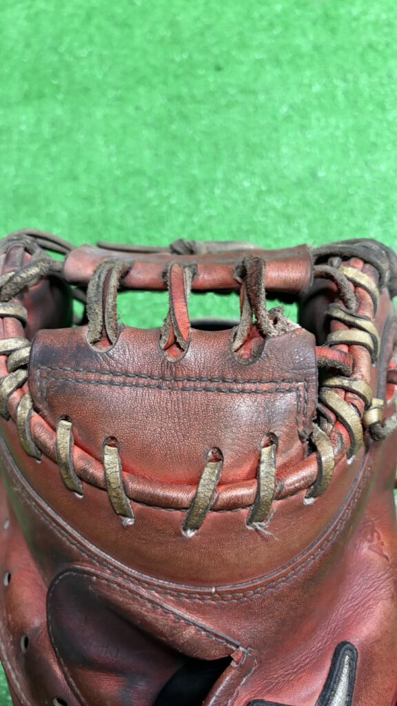 力が逃げやすい箇所を中心に、2本の紐を新品に交換。全体の緩みを締め直すことで、ミット全体の剛性がグッと高まりました。